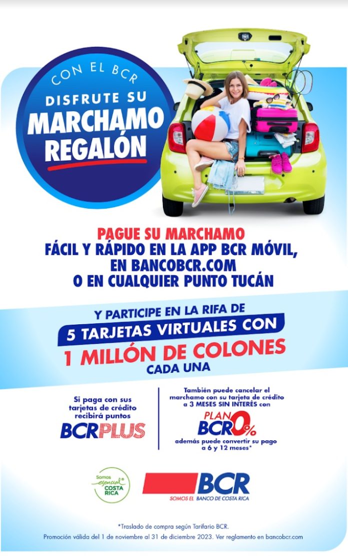 Para este año, los clientes que cancelen su marchamo a través de los Canales Digitales o Puntos Tucán del Banco de Costa Rica (BCR) recibirán una acción electrónica para participar en el sorteo de cinco tarjetas virtuales de ¢1 000 000,00 (un millón de colones) cada una.