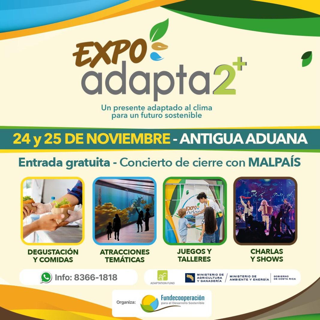 Con el lema “Un presente adaptado al clima para un futuro sostenible”, y en marco del cierre de la primera etapa del Programa Adapta2+, Fundecooperación para el Desarrollo Sostenible realizará una actividad llamada Expo Adapta2+, este viernes 24 y sábado 25 de noviembre en la Antigua Aduana, en San José.