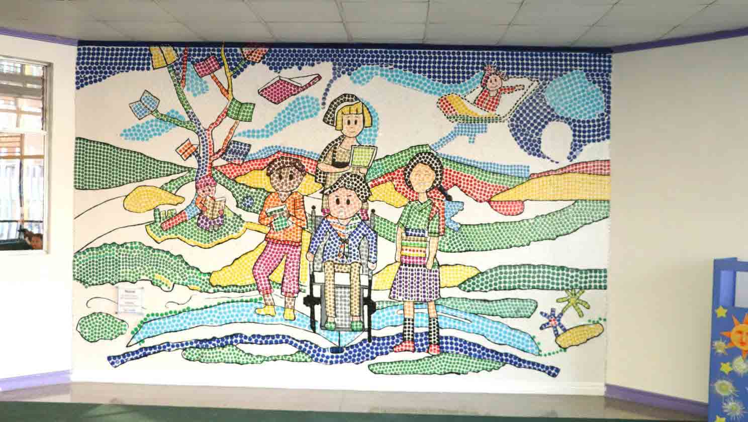 En esta ocasión, el material da vida al mural “El Libro la Llave al Conocimiento”, que está ubicado en la Biblioteca Pública Mario Sancho Jiménez, en Cartago. Para hacerlo una realidad, se ocuparon 150 kilos de las tapas plásticas.