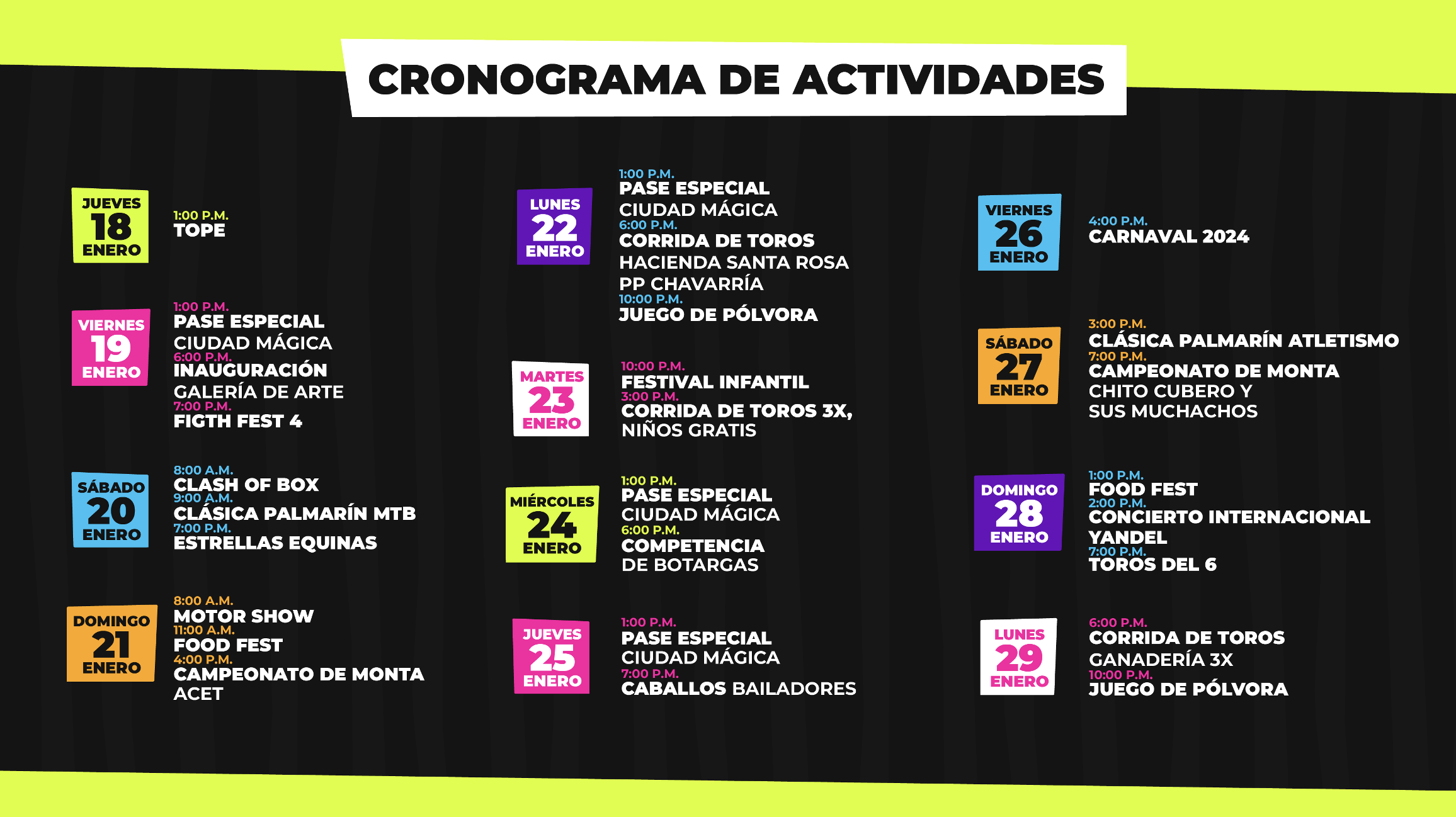 Además, dentro del campo ferial habrá diferentes actividades como la competencia de CrossFit ´Clash OF Box´ el sábado 20 de enero a las 8:00 a.m., con las categorías en parejas, hombres, mujeres, mixta y categoría open, ese mismo día a las 9:00 a.m. se competirá en la ´Clásica Palmarín de MTB´ con un recorrido de 35 km que promete acción, aventura y mucha adrenalina para todos los asistentes y para culminar, el sábado 27 de enero a las 3:00 p.m. se correrá la ´Clásica Palmarín de Atletismo´ de 13.5 km.