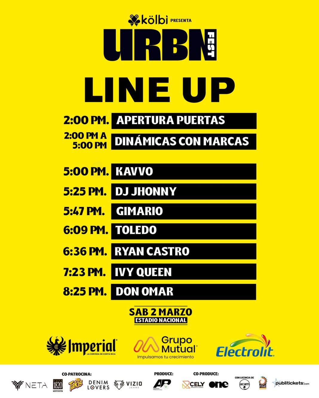 La apertura de puertas será a las 2 pm para darle paso a una tarde noche de música nacional y urbana pues en el escenario se presentarán 3 cantantes costarricenses: Kavvo, Gimario y Toledo. Posterior a ellos, iniciará el show reggaetonero con los artistas internacionales.