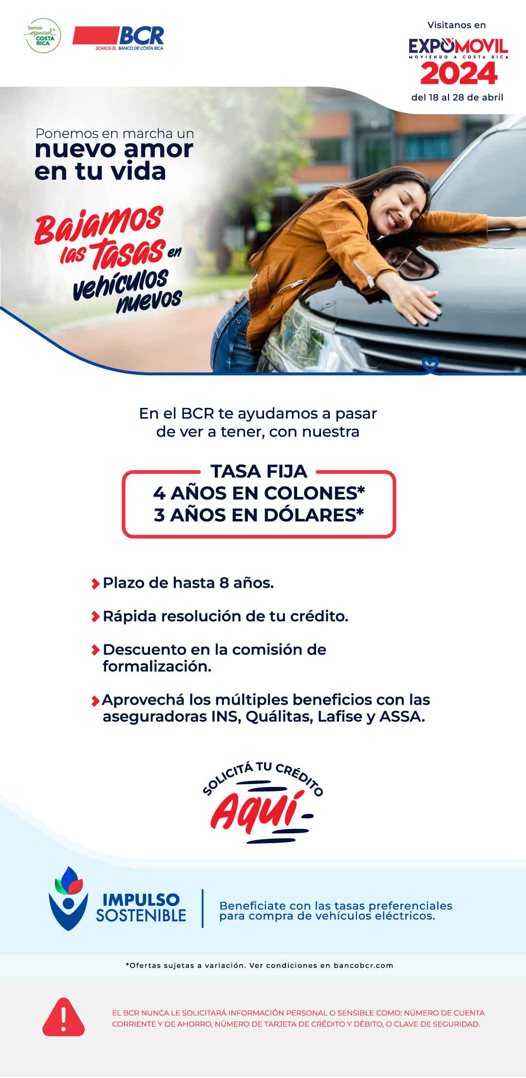 El monto máximo por financiar es de hasta $125 000 o su equivalente en colones a un plazo máximo de hasta ocho años. Además, se ofrecen dos líneas de crédito: la primera para las personas que deseen comprar un vehículo, motocicleta y afines de combustión tradicional y la segunda para quienes opten por vehículos de energías limpias, esto a través del crédito Impulso Sostenible.
