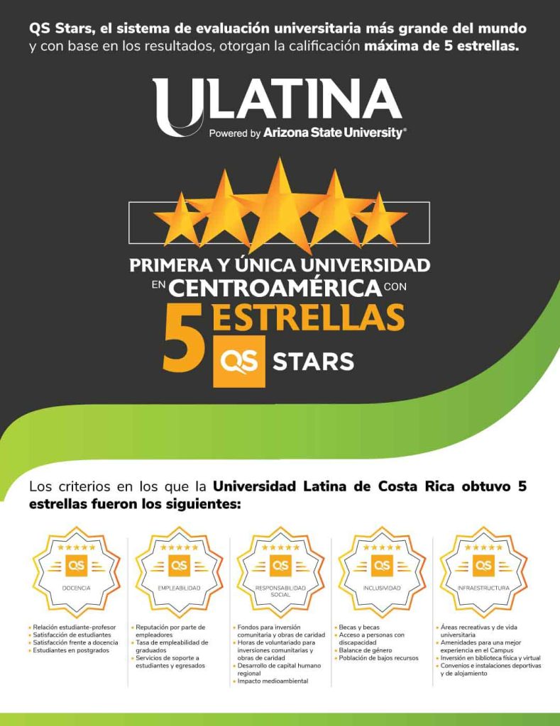 22 de julio de 2024, San José Costa Rica. La Universidad Latina de Costa Rica, recibió la noticia que ha sido reconocida con la máxima calificación de 5 estrellas en la evaluación general del rating mundial QS Stars University. La certificación de QS Rating es un proceso al que voluntariamente se sometió la institución como parte de su compromiso con la calidad y midió de manera integral y en profundidad cada atributo de la experiencia académica de la Universidad, la cual pasa por la docencia, instalaciones, vida universitaria, calidad de la enseñanza, entre otros aspectos.