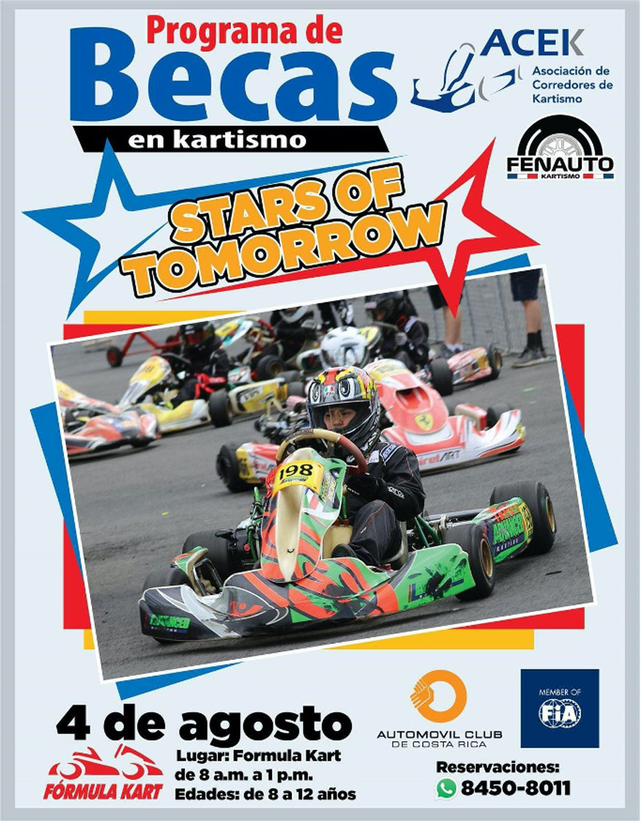 1 agosto 2024- Este año venimos imparables y queremos que más niños y jóvenes desarrollen sus talentos y habilidades en el deporte que representamos. Es por ello, que abrimos de nuevo participación para becar a 6 nuevos pilotos que podrán ser parte de cuatro fechas en el campeonato gracias al programa de becas ¨Stars of tomorrow¨ que busca fomentar el deporte en el país y descubrir nuevos talentos. Este 4 de agosto recibiremos a niños y niñas entre 8 y 12 años en Formula Kart Curridabat, para elegir a los nuevos pilotos de la temporada invierno 2024 quienes serán becados gracias a este curso de Kartismo, organizado por el Automóvil Club de Costa Rica (ACCR) en conjunto con ACEK; con el respaldo financiero de la Federación Internacional del Automóvil (FIA) y ACCR y el apoyo de la Federación de Automovilismo (FENAUTO). Posteriormente los clasificados se medirán en la pista de competencias, en el circuito El Tajo para seleccionar a los becados finales.