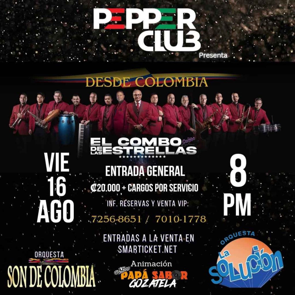 San José, Costa Rica. Pepper Club se ha caracterizado por albergar las grandes orquestas del país, en esta ocasión nos complacemos en presentar a una de las mejores orquestas colombianas, El Combo de las Estrellas.