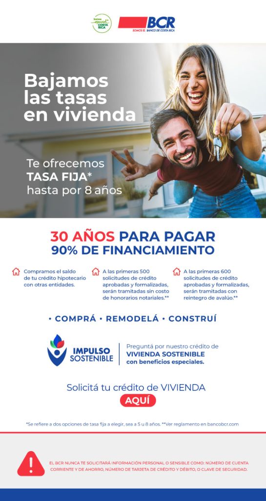 Esta oferta crediticia está disponible en colones o dólares (recomendado para personas que perciben ingresos en esta moneda) con tasas fijas de dos y cinco años se aplica a créditos en colones, luego de ese periodo la tasa será variable. Para los financiamientos en dólares las modalidades de tasa son escalonada y tasa variable. Para “BCR Vivienda Sostenible”, la cuota por millón de colones, a cinco años ronda los ¢7 105, 50 aproximadamente, sin pólizas.