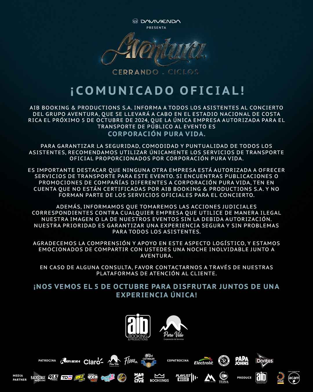 AIB Booking & Productions informa a todos los asistentes al Concierto del Grupo Aventura, que se llevará a cabo en el Estadio Nacional de Costa Rica el próximo 5 de octubre de 2024, que la única empresa autorizada para el transporte de público al evento es Corporación Pura Vida.