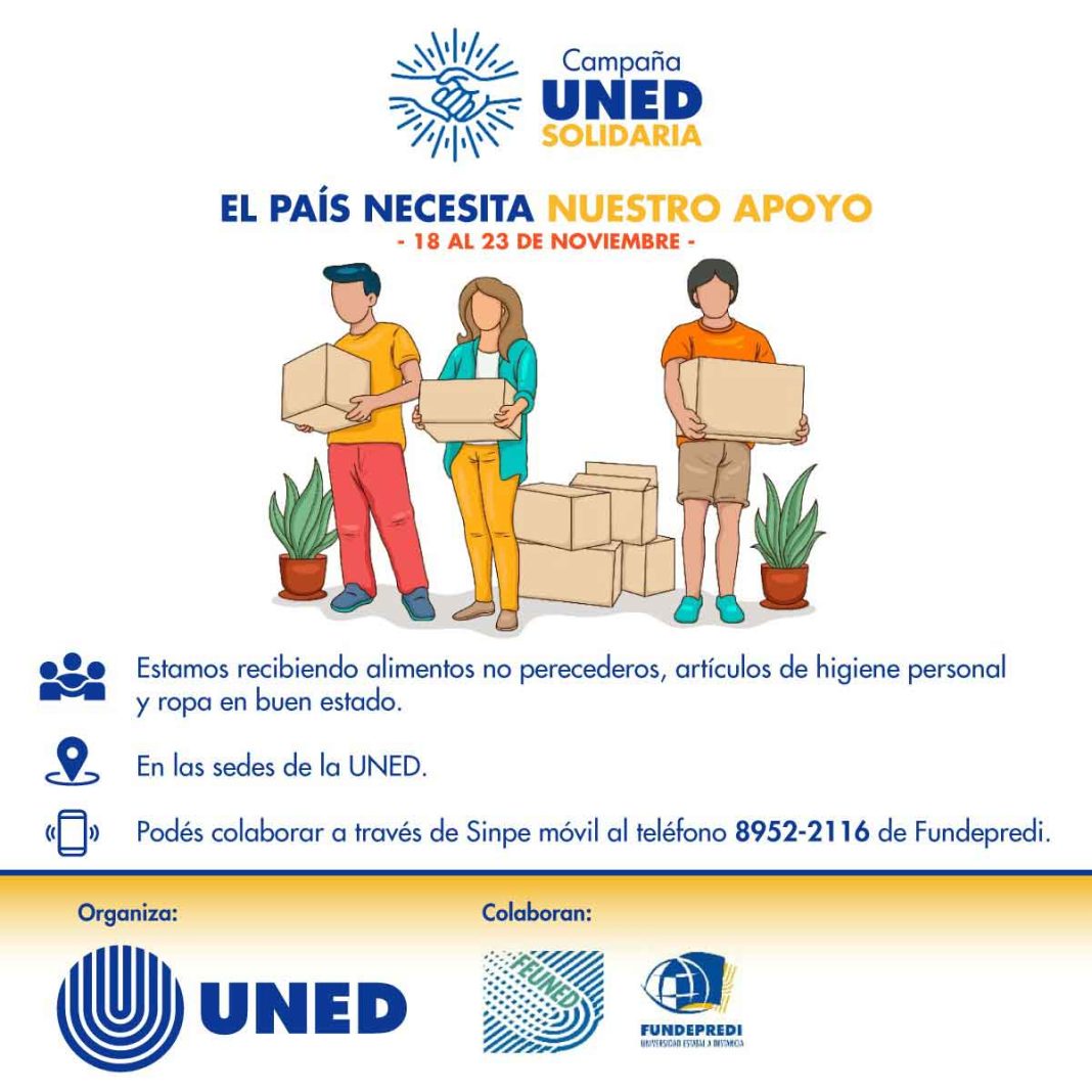 “UNED Solidaria” es impulsada por la Universidad Estatal a Distancia (UNED), con el apoyo de Fundepredi, la Federación de Estudiantes (FEUNED) y las sedes universitarias en el territorio nacional.