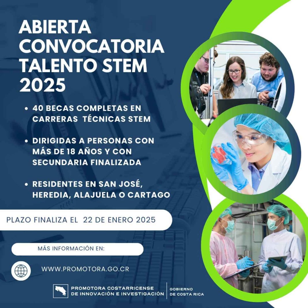 8 de enero 2025, San José, Costa Rica. La Promotora Costarricense de Innovación e Investigación (PCII) anunció el lanzamiento de “Talento STEM 2025”, una iniciativa estratégica que busca fortalecer el desarrollo económico de Costa Rica a través de la inversión en capital humano altamente calificado.  Esta convocatoria, que se lanza por tercer año consecutivo, ofrece en esta ocasión 40 becas completas para que costarricenses y ciudadanos naturalizados, puedan cursar carreras técnicas en las áreas de Ciencia, Tecnología, Ingeniería y Matemáticas (STEM).  La iniciativa se enmarca en la Ley 7169, Ley de Promoción del Desarrollo Científico y Tecnológico.