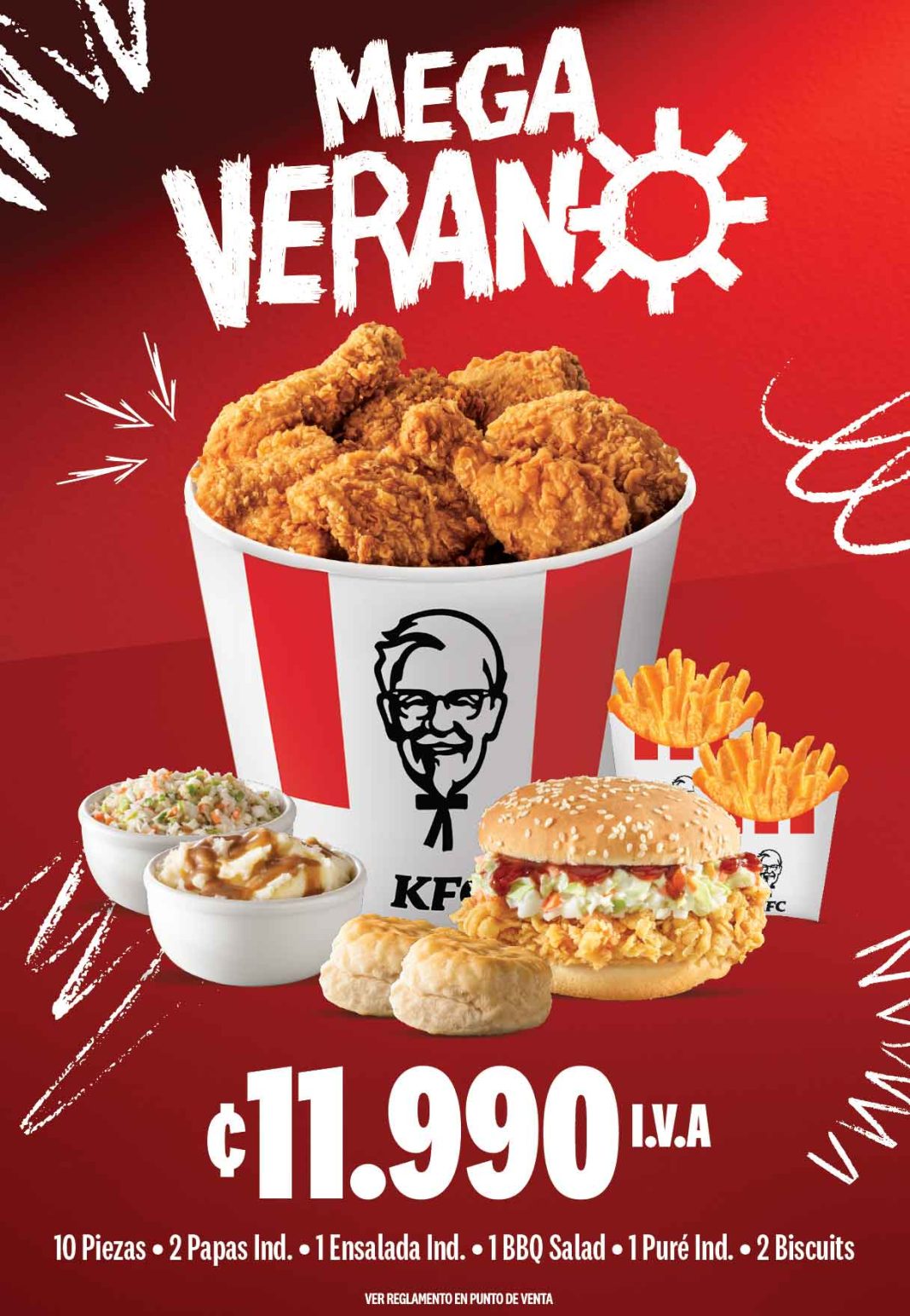 - Mega Verano compuesto por 10 piezas de pollo, 2 papas individuales, 1 ensalada individual, 1 hamburguesa BBQ Salad, 1 puré individual y 2 biscuits con un precio especial de 11.990 colones.