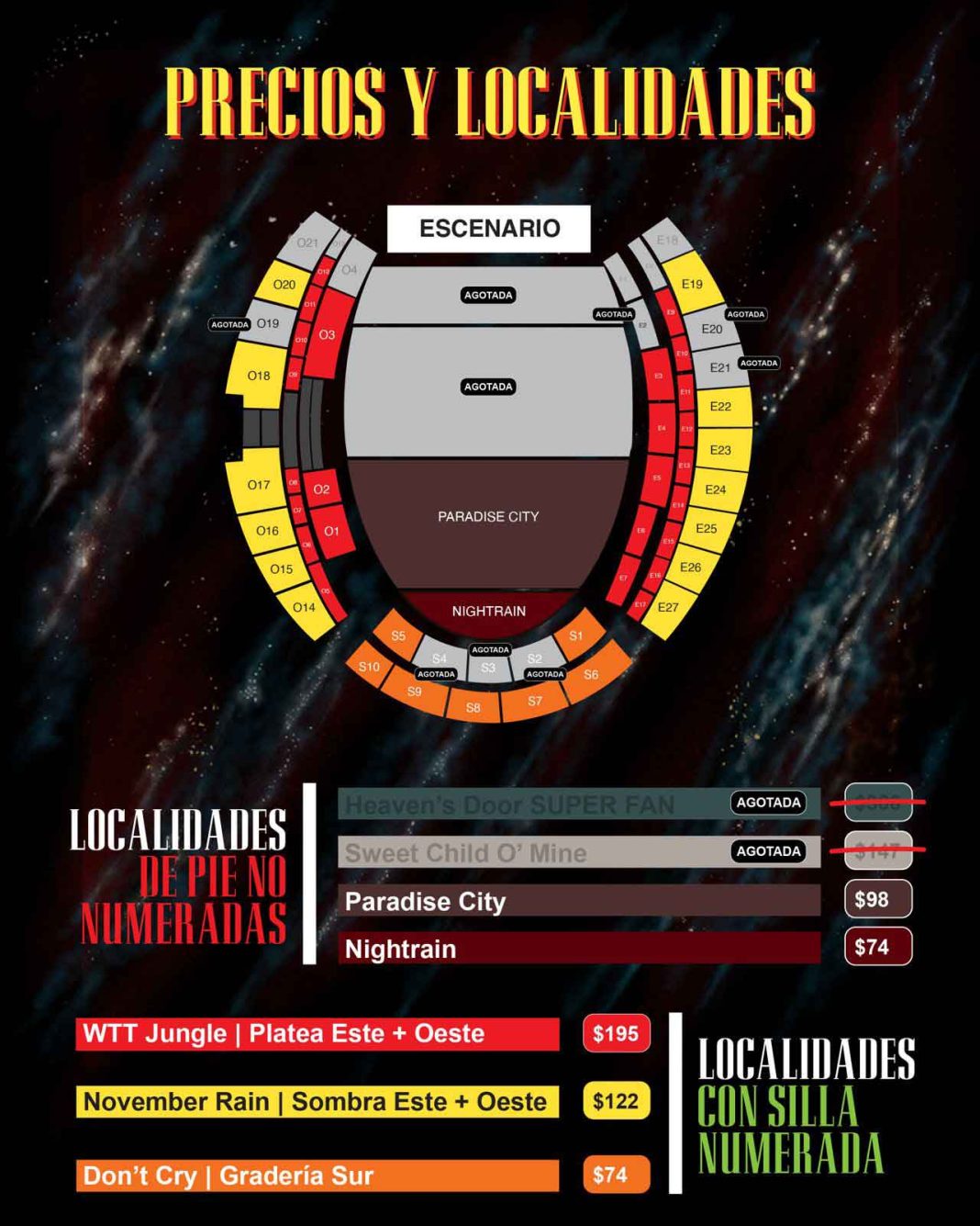 Los sectores que aún se pueden adquirir son: Night Train (Gramilla) y Don’t Cry (Gradería Sur) con un valor de $74. También hay localidades en Paradise City (Gramilla) por $98, en Welcome to the Jungle (Platea Este & Oeste) a $195 y November Rain (Sombra Este & Oeste) a $122.