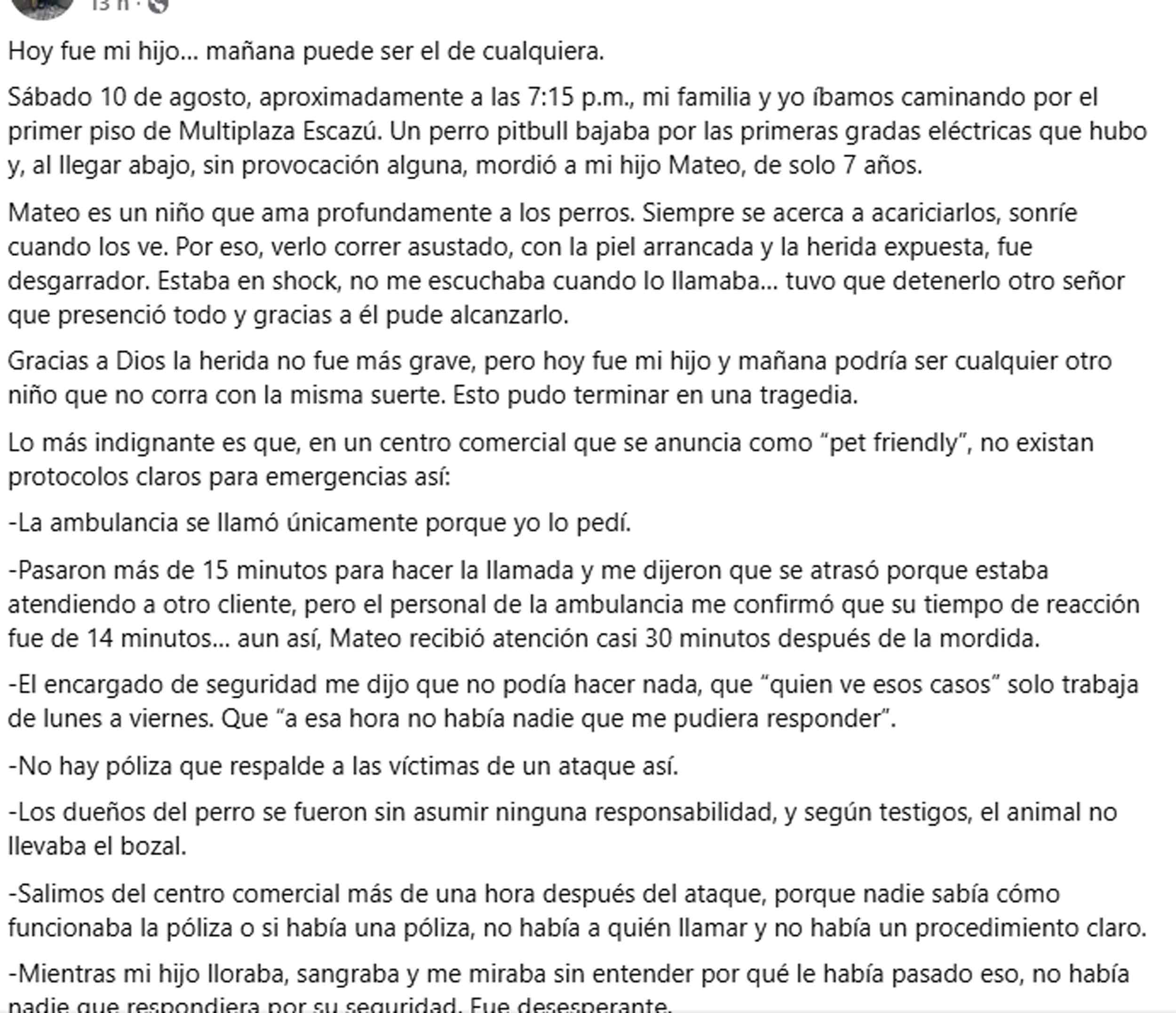 Un incidente alarmante ocurrió la noche del sábado en Multiplaza Escazú cuando un niño de 7 años fue mordido por un perro. Según la madre de la víctima, el ataque ocurrió sin provocación cuando el animal descendía por las escaleras eléctricas alrededor de las 7:15 p.m.