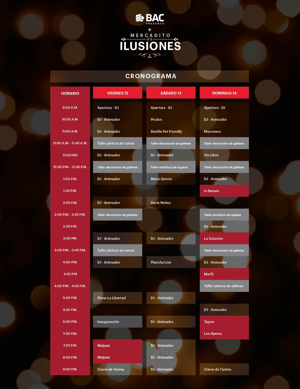 Durante el fin de semana del Mercadito de Ilusiones, el público podrá disfrutar de actividades como talleres de pintura, de decoración navideña y de galletas, desfile de mascotas, música a cargo de DJ, la participación de Maromero y conciertos con las agrupaciones Vía Libre, La Solución y Marfil. El cierre del Mercadito, el domingo 14 de diciembre, a partir de las 6 p.m., estará a cargo de Tapón y Los Ajenos.