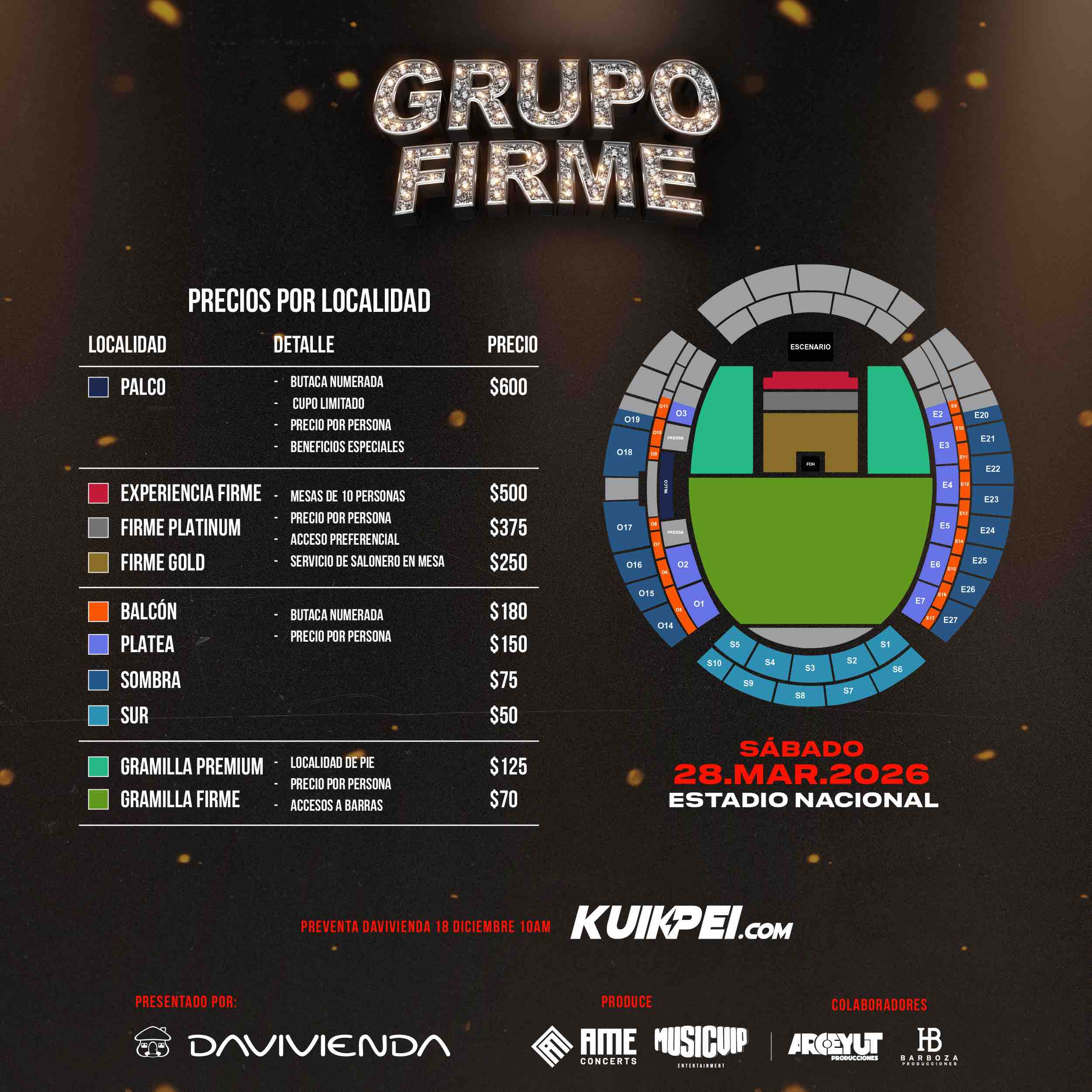 El acceso a las entradas contará con una preventa exclusiva para tarjetahabientes Davivienda, la cual se habilitará desde este jueves 18 de diciembre a las 10:00a.m. hasta el domingo 21 de diciembre a las 10:00a.m. Durante este periodo, los clientes del banco podrán disfrutar de beneficios especiales, como la opción de Paguitos Davivienda a 3 y 6 meses sin intereses, así como una promoción 2×1 en la localidad Gramilla Firme, válida hasta agotar existencias.
