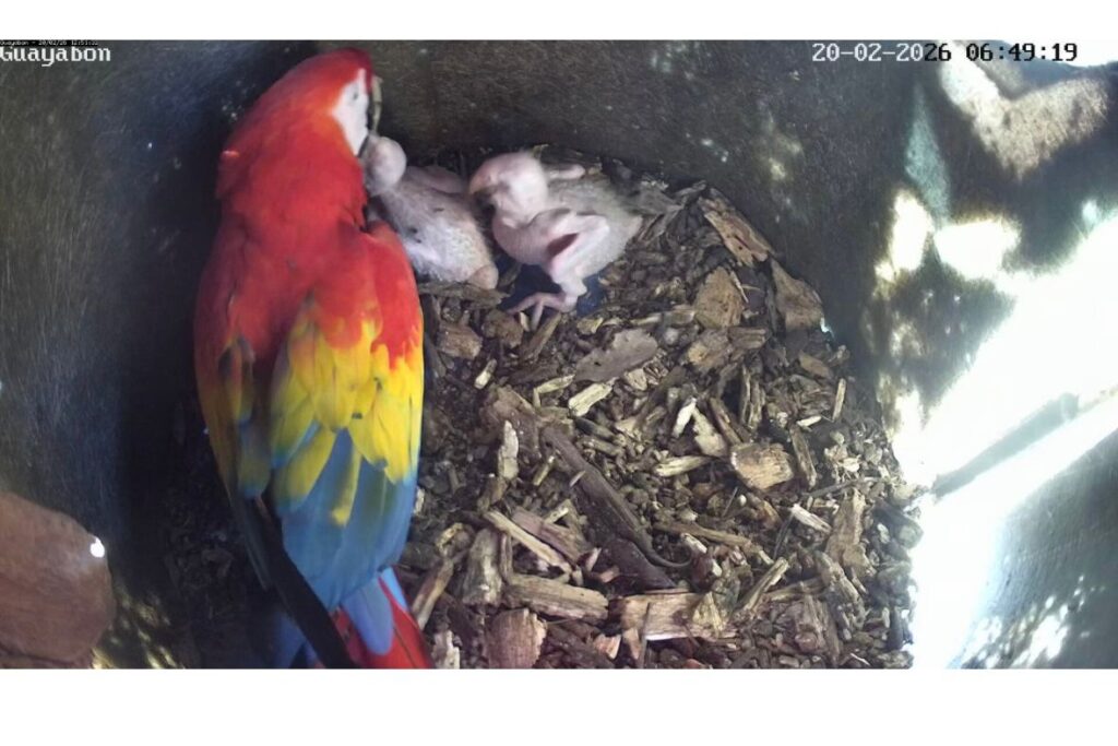 Arranca anidación de Lapas Rojas en Punta Leona: vea en tiempo real el nacimiento de pichones