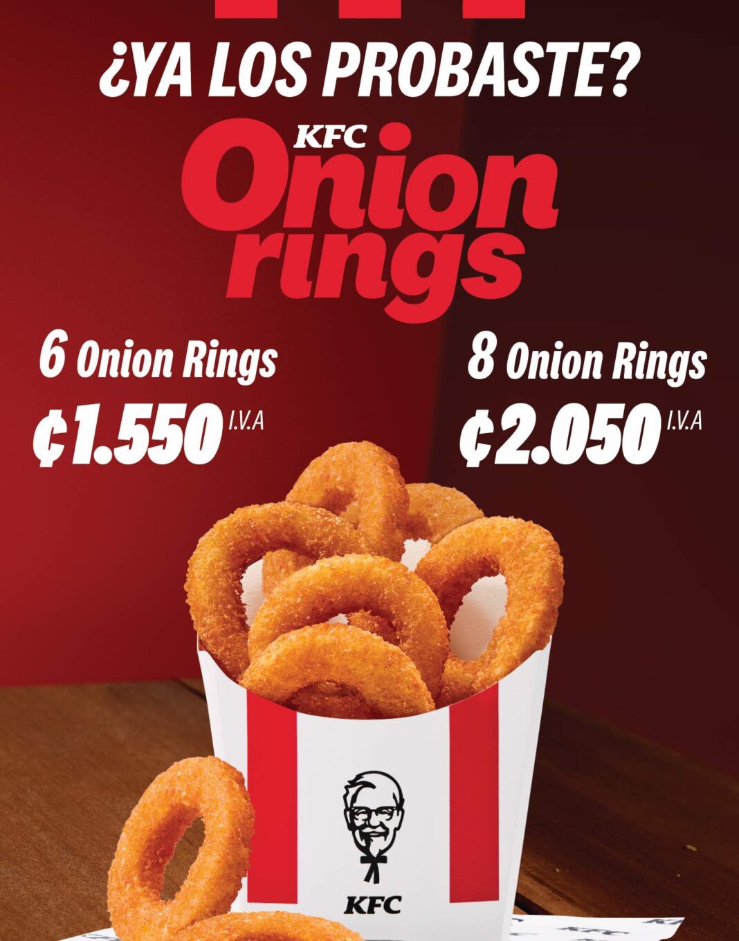 Los Onion Rings estarán disponibles como acompañamiento en presentaciones de 6 unidades por ₡1.550 y 8 unidades por ₡2.050. Además, formarán parte del Combo Chicken Sandwich, que incluye 1 Onion Rings Chicken Sandwich, 1 bebida de 22 oz y 1 acompañamiento individual por ₡5.390; y del Combo Twister, que incluye 1 Onion Rings Twister, 1 bebida de 22 oz y 1 acompañamiento individual por ₡5.290.